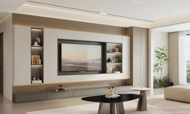 门板用按压开门,不要把手,和墙同色,视觉会更集成。2026的升级是做半高电视墙,下方连续壁挂柜,上方留白,再搭配一到两条细层板。