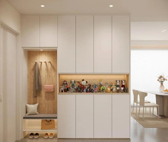 搭配洞洞板、挂钩,包包、帽子、鞋油各有位置。2026的升级是做整墙薄柜,但表面像墙,无把手,按压开,门片可做镜面,兼顾穿衣检视。